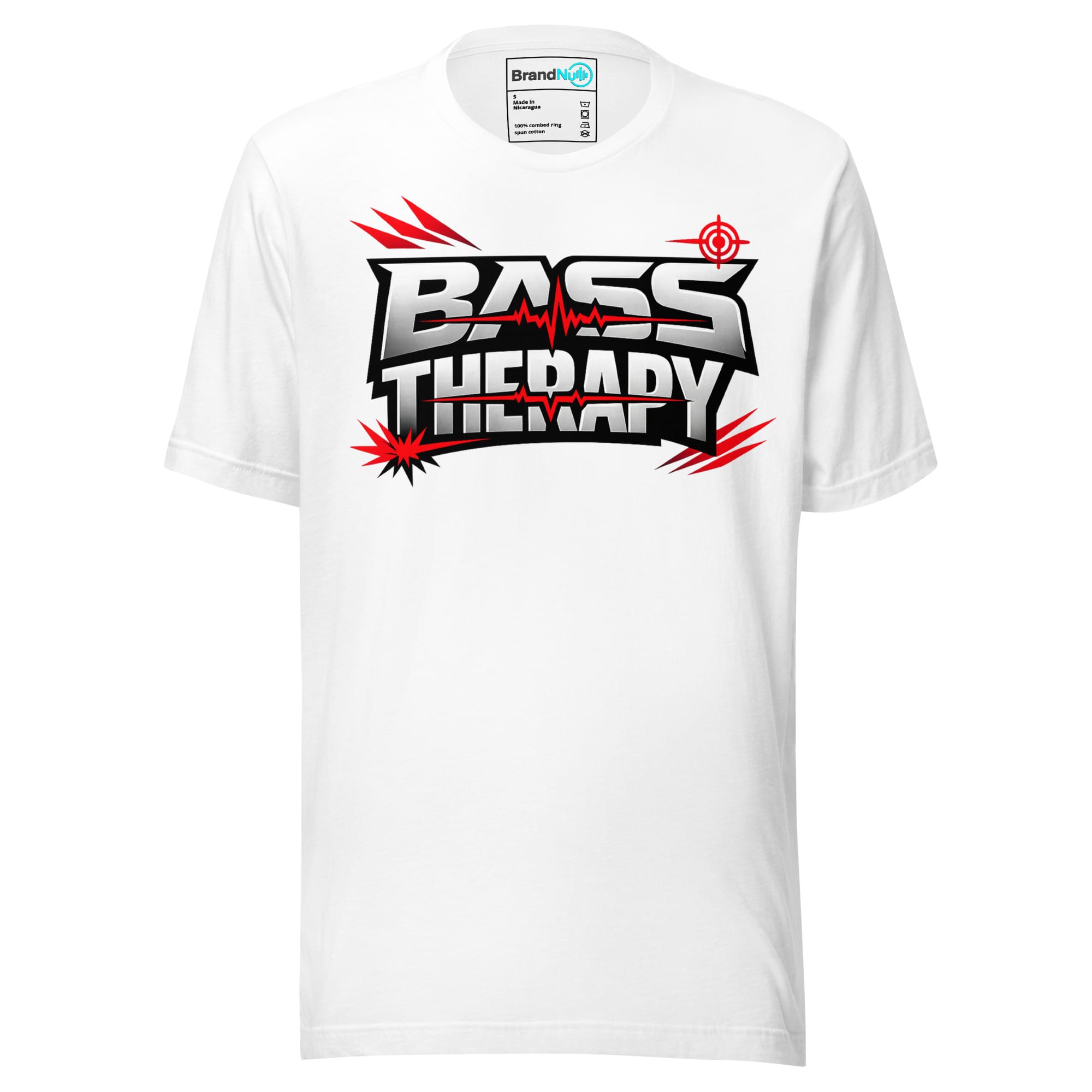 Bass therapy logo design with sharp rave style lettering inspired by sound system culture and heavy sub bass sessions, clean bold graphic for drum and bass lovers t shirt