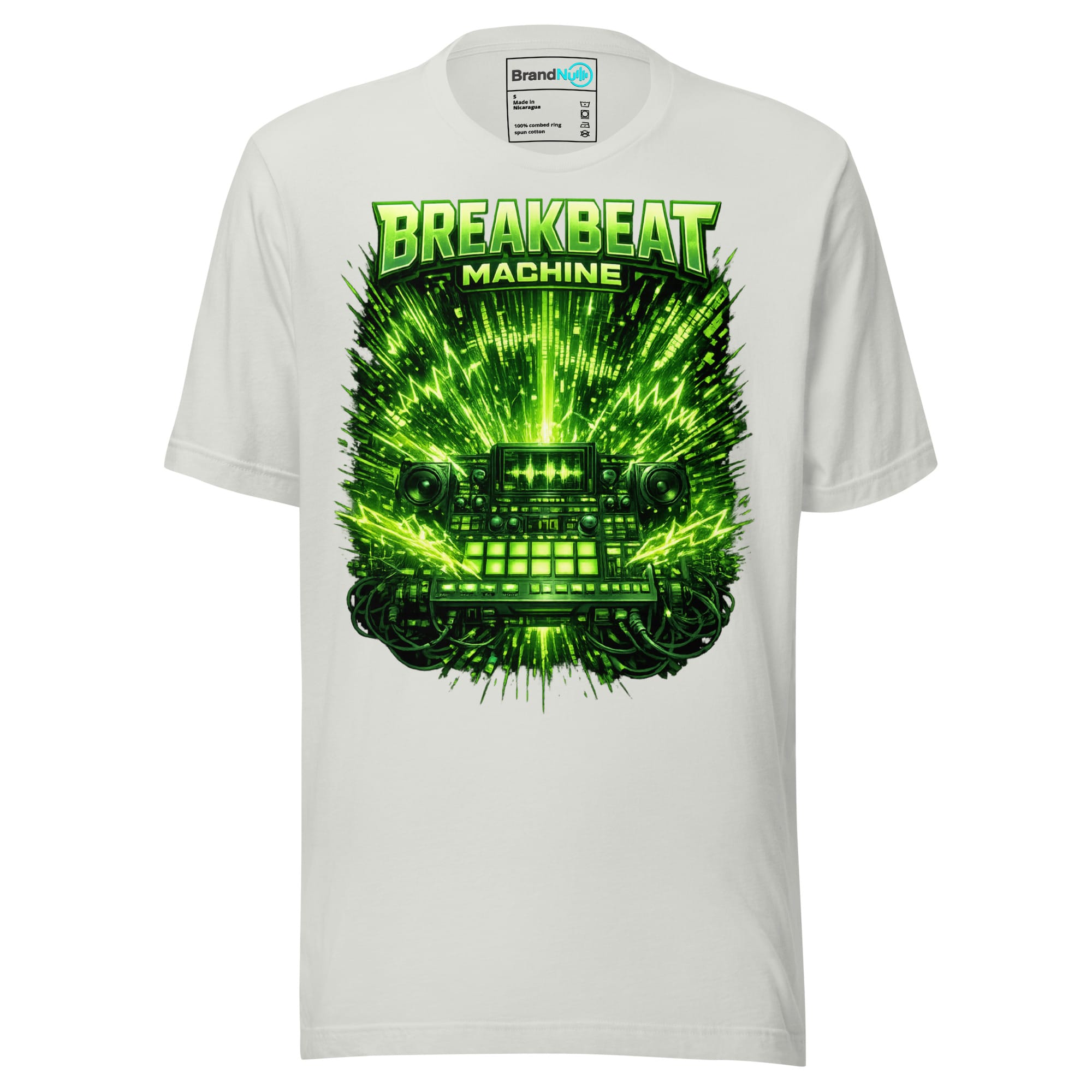 Breakbeat machine design with intense sound energy and mechanical rave visuals using green screen elements, clean bold layout inspired by drum and bass production culture t shirt