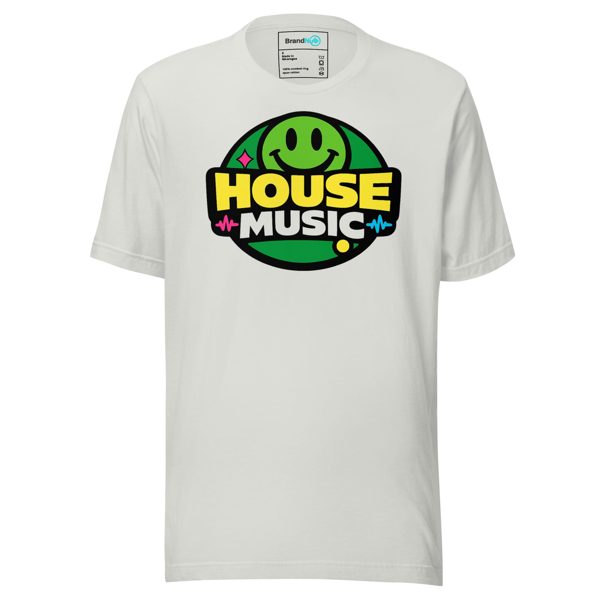 House music t shirt with a compact smiley badge look. Clean, fun, and instantly recognisable for everyday house music lovers.